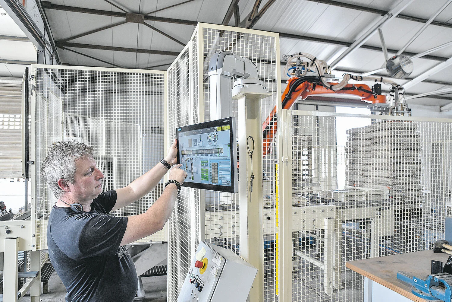 Der bringt nicht nur die besagte Ausfallsicherheit mit sich, sondern weitere Vorteile: So kann Anlagenführer Olaf Josten jetzt auf Knopfdruck vorgeben, wie die Lagen auf den Paletten aufgebaut werden, wie hoch oder niedrig der Roboter stapelt und vieles mehr. „Wir sind dadurch jetzt viel flexibler, können Paletten auch nach individuellem Kundenwunsch packen“, erklärt Josten. Wobei „Knopfdruck“ nicht ganz zutreffend ist: die Bedienung erfolgt mittels animiertem Touch-Screen, der jederzeit anzeigt, wo sich gerade welcher Sack in der Anlage bewegt.