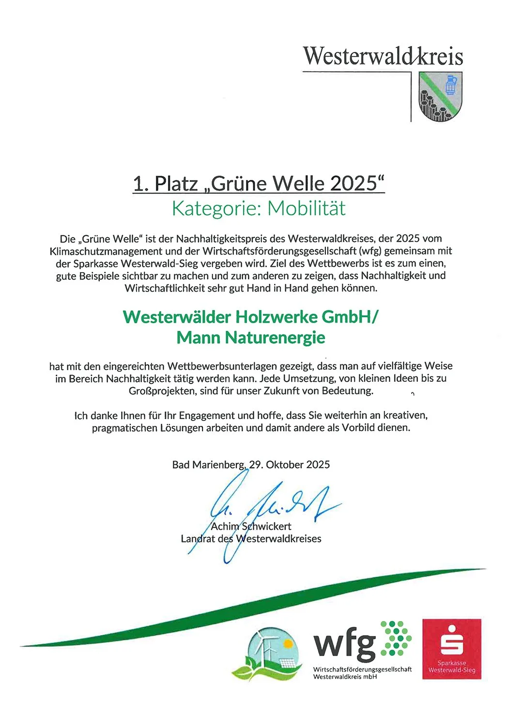 /Nach der Premiere in 2022 ist dieser Nachhaltigkeitspreis 2025 zum zweiten Mal vergeben worden: Die „Grüne Welle“ des Westerwaldkreises solle „gute Beispiele sichtbar machen“ und „zeigen, dass Nachhaltigkeit und Wirtschaftlichkeit sehr gut Hand in Hand gehen können.“ Gerade letzteres ist bei den „Westerwälder Holzwerken“ (WWHW) und „MANN Naturenergie“ seit Jahren das Ziel des unternehmerischen Handelns. So überraschte es nicht allzu sehr, als die MANN-Gruppe bei der „Grünen Welle“ 2025 den ersten Platz in der Kategorie Mobilität erreichen konnte.