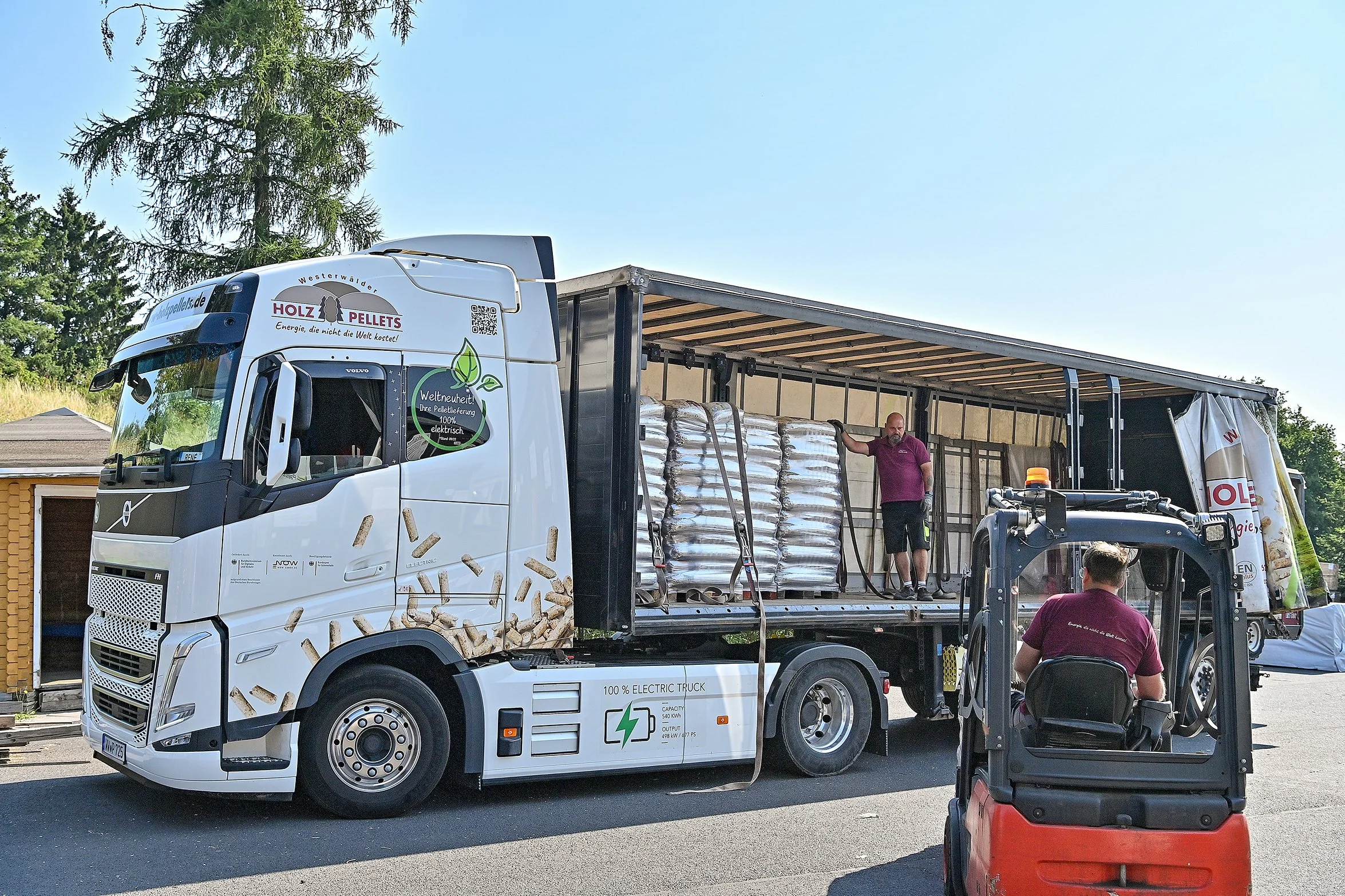 Bei den WWHW wird ein Auflieger mit Westerwälder Holzpellets in Säcken beladen. Gezogen wird die Fracht von einem vollelektrischen „Volvo“ mit einer 540 Kilowattstunden fassenden Batterie. Foto: Schmalenbach