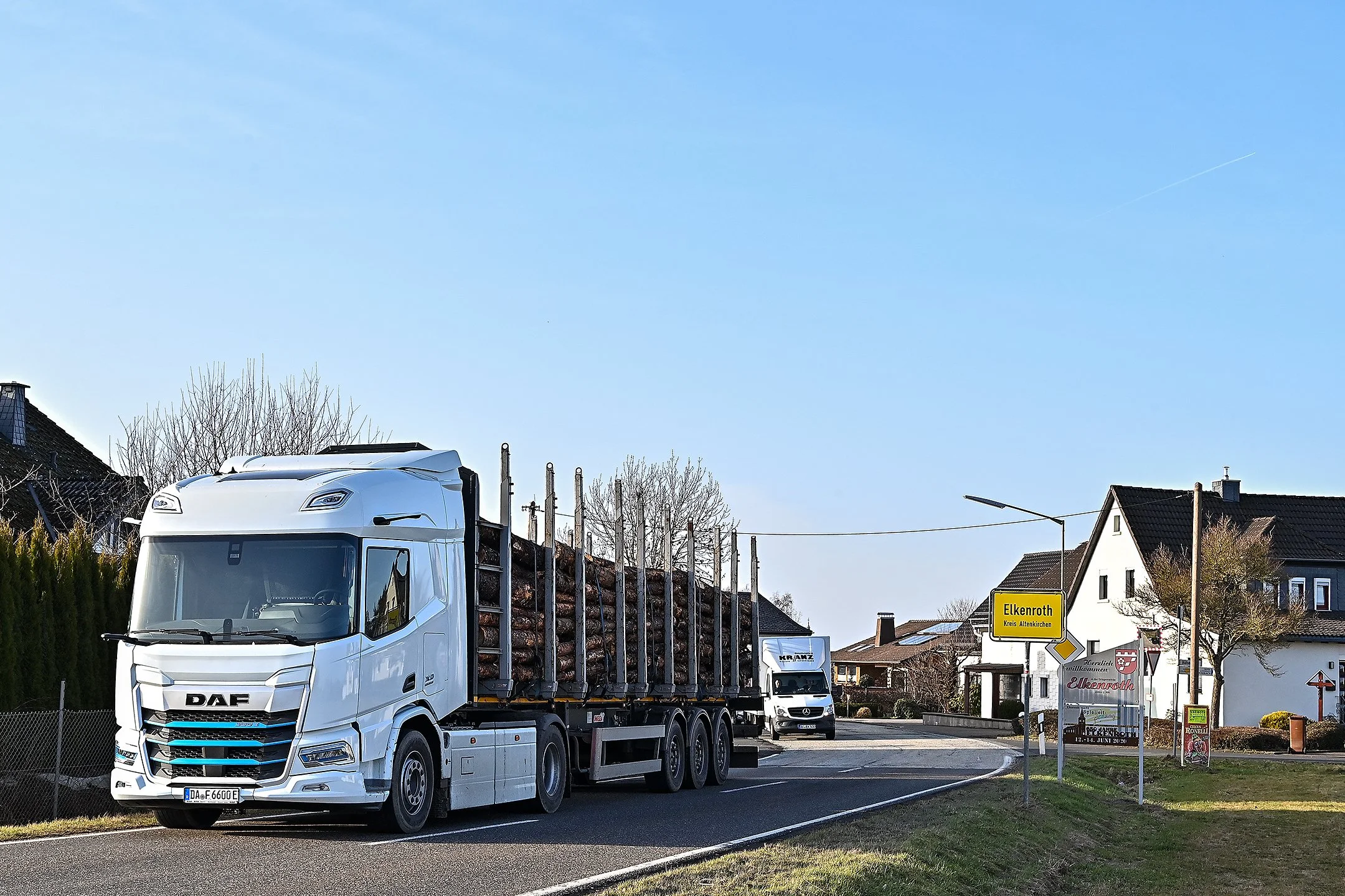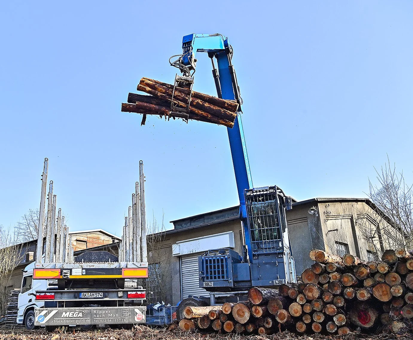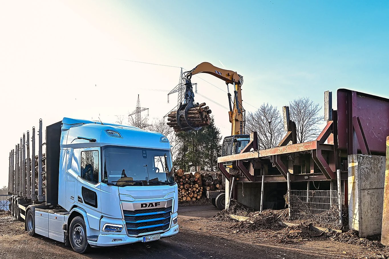 2,50 Meter lang und schätzungsweise 15 bis 40 Zentimeter stark sind die Rundholzabschnitte, die er mit dem Bagger nach seiner Ankunft am einstigen „Basalt-Bahnhof“ greift und sorgsam auf den Trailer am elektrischen „DAF“ lädt. Maximal fünf Stöße passen bei dieser Abschnittslänge hintereinander auf den Auflieger. Je zehn Rungen stützen das Holz auf beiden Seiten, doch bis zu deren Oberkante kann Stefan Sturm das Fahrzeug nicht beladen, um im Rahmen des gesetzlich zulässigen Höchstgewichts zu bleiben.